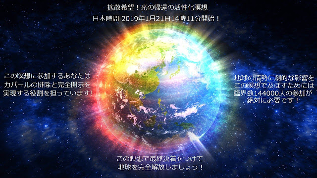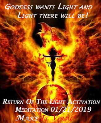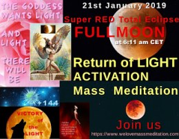 Στις 20/21 Ιανουαρίου θα γίνει ένας πολύ σημαντικός διαλογισμός κατά τη διάρκεια της κορύφωσης της σεληνιακής έκλειψης. Ο διαλογισμός αυτός οργανώνεται μετά από αίτημα του Cobra ώστε να αγκυροβοληθεί όσο δυνατόν περισσότερο φως στην επιφάνεια του πλανήτη. Κάτι τέτοιο θα βοηθήσει να λυθεί το τέλμα μεταξύ του Φωτός και των σκοτεινών δυνάμεων, ώστε τελικά η ανθρωπότητα να ελευθερωθεί. Γι’ αυτόν το λόγο δόθηκε σε αυτό το διαλογισμό η ονομασία «Επιστροφή Ενεργοποίησης Φωτός»