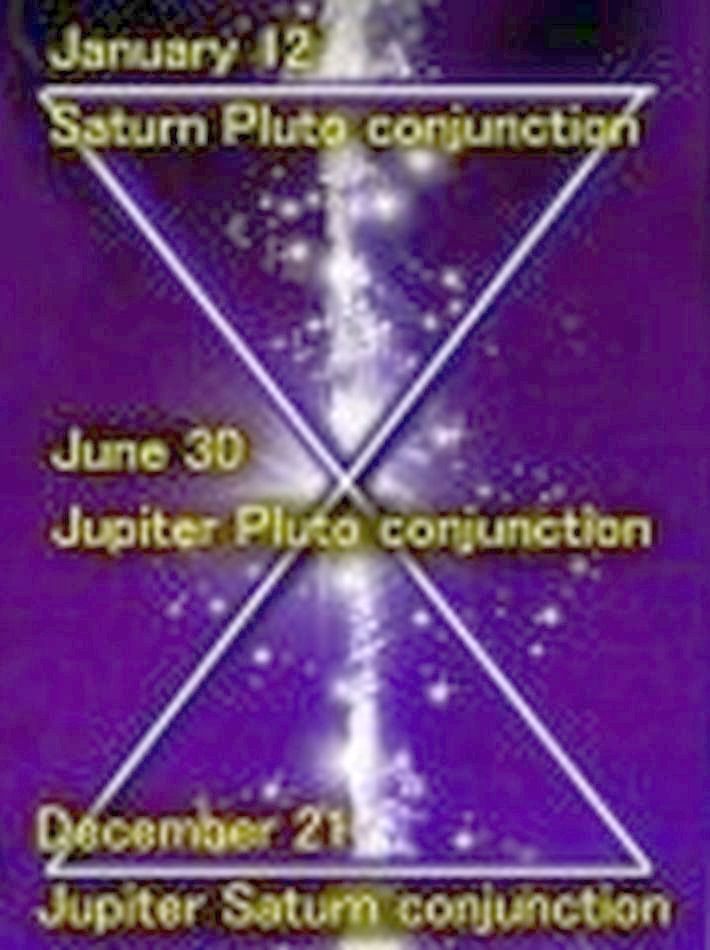 Ο Δίας και ο Κρόνος στις 0°29’ Υδροχόου θα σχηματίσουν ένα μεγάλο τρίγωνο ακριβείας με την Αλκυόνη (τον τοπικό μας κεντρικό ήλιο στις Πλειάδες) στις 0°17’ των Διδύμων, και το γαλαξία Μ87 (μείζων γαλαξίας στο σύμπλεγμα της Παρθένου, ως πηγή γαλαξιακής αγάπης για το τμήμα αυτό του σύμπαντος) στις 1°13’ του Ζυγού. Αυτό το μεγάλο τρίγωνο θα φέρει εξαιρετικά ισχυρές ενέργειες κοσμικής αγάπης στον πλανήτη, κάτι που θα πυροδοτήσει την έναρξη του νέου κύκλου Εποχής του Υδροχόου. Η έκλαμψη των ενεργειών κοσμικής αγάπης θα προέλθει από τον γαλαξία Μ87 στο υπερσύμπλεγμα της Παρθένου και θα είναι πολύ πιο ισχυρή από την έκλαμψη που έφτασε στη Γη από τον Μ87 κατά την ενεργοποίηση της Πύλης ΑΙΟΝ: