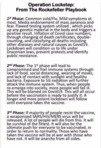 Πολλά άλλα έγγραφα έχουν κυκλοφορήσει από πληροφοριοδότες, καθιστώντας σαφές ότι αυτή η εκστρατεία «πανδημίας» είχε προγραμματιστεί πολύ νωρίτερα, προκειμένου να εξαναγκάσει τον πληθυσμό να δεχτεί εμβόλια τα οποία περιέχουν μικροτσίπ που μεταβάλλουν το DNA. Θυμηθείτε πως η λέξη COVID-19 σημαίνει Certificate of Vaccination Identification 2019 (Πιστοποιητικό Ταυτότητας Εμβολιασμού 2019).