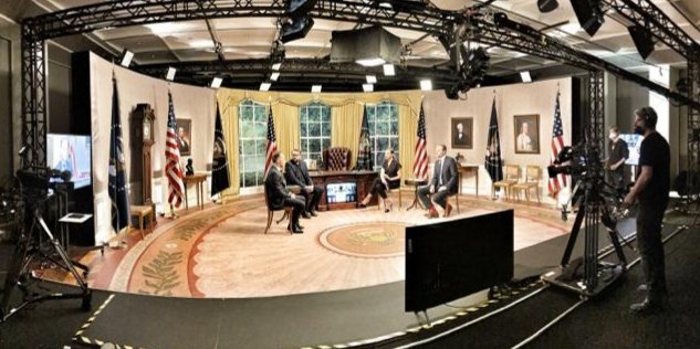 Εδώ είναι μια εικόνα του οβάλ γραφείου σε κινηματογραφικό στούντιο όπου γυρίζουν τον λεγόμενο «Πρόεδρο» Biden χρησιμοποιώντας χολιγουντιανά εφέ.