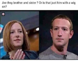 Εδώ είναι μια φωτογραφία που συγκρίνει τη γραμματέα Τύπου του Τζο Μπάιντεν, Jen Psaki, με τον Μαρκ Ροκφέλερ Τσούκερμπεργκ. Προφανώς έχουμε να κάνουμε είτε με στενούς συγγενείς, είτε τον Μαρκ συκιά είτε κλώνους.