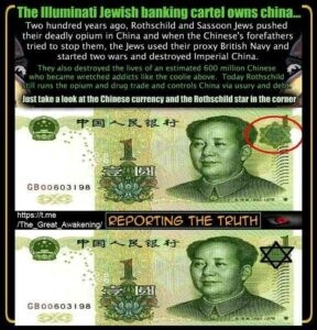 Περιττό να πούμε ότι ένα μεγάλο μέρος της ηγεσίας του Κινεζικού Κομμουνιστικού Κόμματος συμμετέχει σε αυτό το έγκλημα. Η Μοσάντ μας έστειλε αυτή την εικόνα ενός μαοϊστικού κινέζικου χαρτονομίσματος του ενός γιουάν με ένα σαφές σιωνιστικό σύμβολο πάνω του. Πηγές των Ασιατικών Μυστικών Κοινωνιών, από την πλευρά τους, υπόσχονται να εκκαθαρίσουν όλα τα μπάσταρδα τέκνα του Ντέιβιντ Ροκφέλερ από τη δομή εξουσίας της Κίνας.