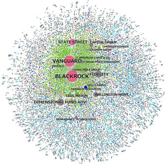 Οι BlackRock/Vanguard κατέχουν επίσης μετοχές μιας μακράς λίστας άλλων εταιρειών, στις οποίες συμπεριλαμβάνονται οι Microsoft, Apple, Amazon, Facebook και Alphabet Inc. Όπως φαίνεται στο παρακάτω γράφημα του δικτύου ιδιοκτησίας της BlackRock και της Vanguard, το οποίο παρουσιάστηκε στο άρθρο του 2017 «Αυτές οι Τρεις Εταιρείες Κατέχουν την Εταιρική Αμερική» στο The Conversation, θα ήταν σχεδόν αδύνατο να απαριθμηθούν όλες.