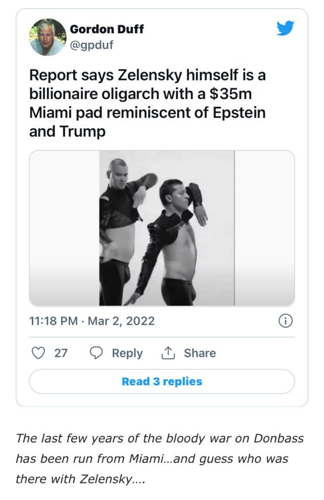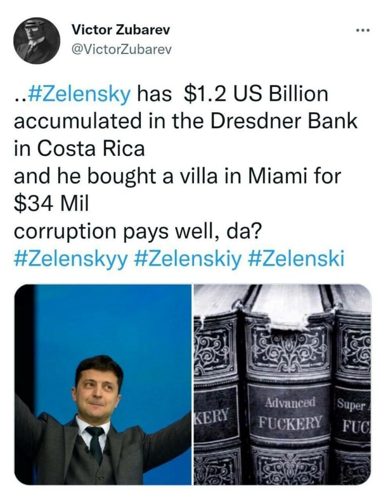 Η FSB και η CIA λένε και οι δύο ότι ο Ουκρανός πρόεδρος-μαριονέτα της Χαζαρικής Μαφίας, Βολοντίμιρ Ζελένσκι, έχει καταφύγει εδώ και καιρό στην Πολωνία. Του υποσχέθηκαν επίσης πλούσια συνταξιοδότηση στη Φλόριντα. Δείτε συνημμένες φωτογραφίες των περιουσιακών του στοιχείων στην Κόστα Ρίκα στην Τράπεζα Dresner (1,3 δισεκατομμύρια δολάρια) και το σπίτι του αξίας 34 εκατομμυρίων δολαρίων στο Μαϊάμι της Φλόριντα.