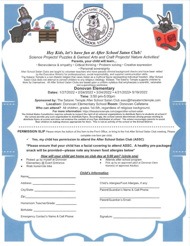 Στη συνέχεια, έχουμε ένα δημοτικό σχολείο στο Ιλινόις το οποίο μοιράζει φυλλάδια που προωθούν ένα «After School Satan Club» («Κλαμπ Σατανιστών Μετά το Σχόλασμα»):