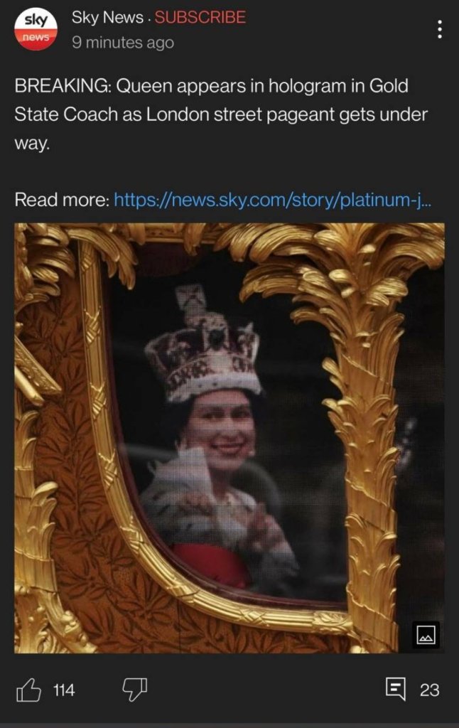 Σε αυτό που φαίνεται να είναι η συμβολή της στο έργο blue beam για τον εορτασμό έναρξης μιας νέας Χρυσής Εποχής, ταξίδεψε πίσω 70 χρόνια κι εμφανίστηκε ως ολόγραμμα στην αρχαία Βρετανική Βασιλική Άμαξα.