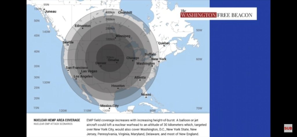 Το πραγματικό σχέδιο είναι να αποσταλεί μια υπερηχητική κεφαλή με προσαρτημένο ένα πολύ ισχυρό EMP. Χρειάζονται 40 δευτερόλεπτα για να φτάσει στο κατάλληλο υψόμετρο και τον προορισμό της μετά την εκτόξευση από ένα υποβρύχιο στα ανοικτά της Ανατολικής Ακτής. Μπορεί να εξαφανίσει όλα τα ηλεκτρικά συστήματα στο μεγαλύτερο μέρος των ΗΠΑ και σε μεγάλο μέρος του Καναδά εάν απελευθερωθεί πάνω από την περιοχή της Ομάχα. Όσο πιο ψηλά απελευθερώνεται τόσο μεγαλύτερη είναι η περιοχή κάλυψης. (Δείτε συνημμένο φωτογραφικό γράφημα που δείχνει την ακτίνα). Οι αρχές γνωρίζουν πολύ καλά τις προθέσεις. Αυτό δεν συζητείται δημόσια από την Ουάσινγκτον και το ψεύτικο σόου του Μπάιντεν.