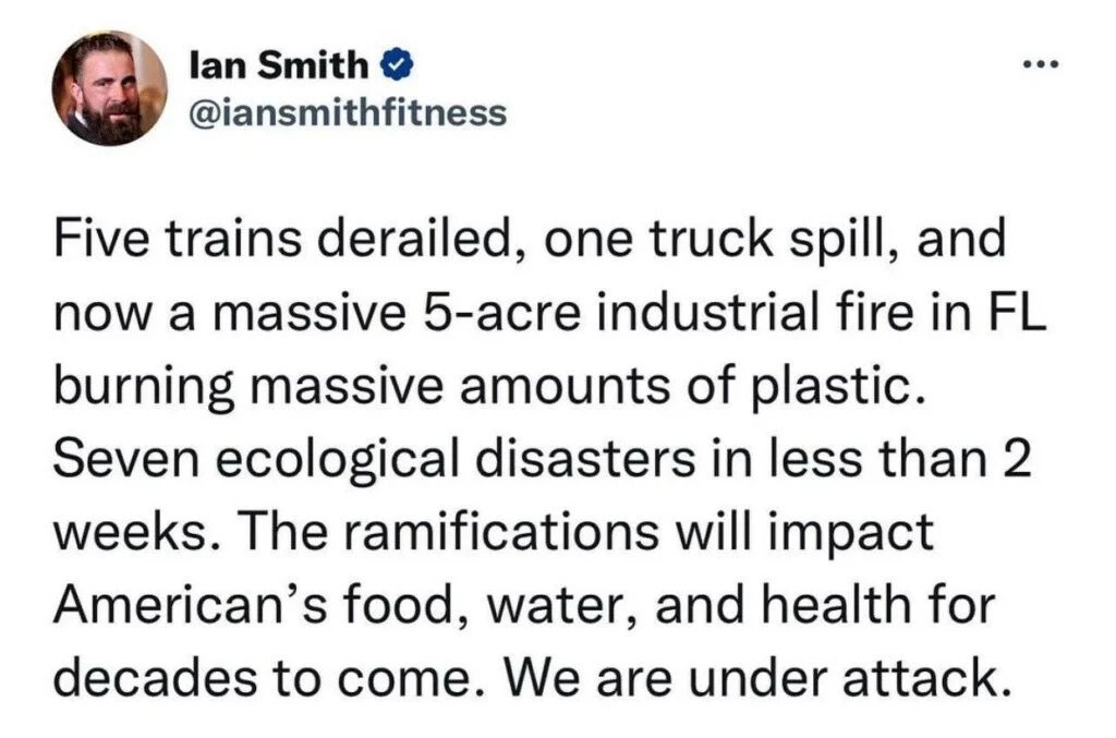 Αυτό που φαίνεται να συμβαίνει είναι ότι γίνονται πραγματικοί εκτροχιασμοί τρένων, αλλά ακολουθούνται από υπερβολικές αναφορές για τοξικές αναθυμιάσεις κ.λπ. Αυτό είναι το μοτίβο που παρατηρήθηκε στη Φουκουσίμα, όπου την πραγματική έκρηξη και το πραγματικό τσουνάμι ακολουθήσαν εξαιρετικά υπερβολικές αναφορές ότι «ολόκληρος ο Ειρηνικός Ωκεανός» ήταν ραδιενεργός. Οι Ροκφέλερ έχουν μακρά ιστορία σε αυτού του είδους τις επιχειρήσεις.