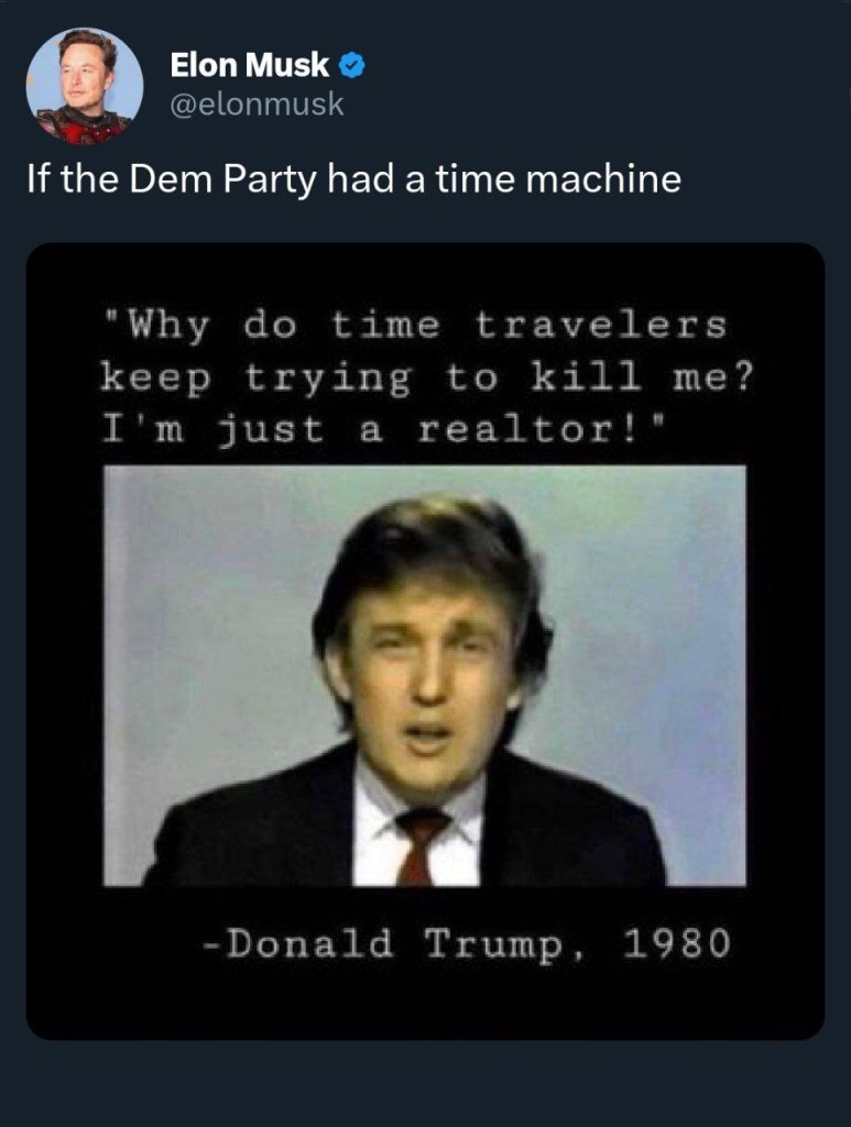 Στη συνέχεια, σημειώνουμε το αστείο του Elon Musk ότι το 1980 ο Trump είπε: «Γιατί οι ταξιδιώτες του χρόνου συνεχίζουν να προσπαθούν να με σκοτώσουν; Είμαι απλά ένας κτηματομεσίτης!»