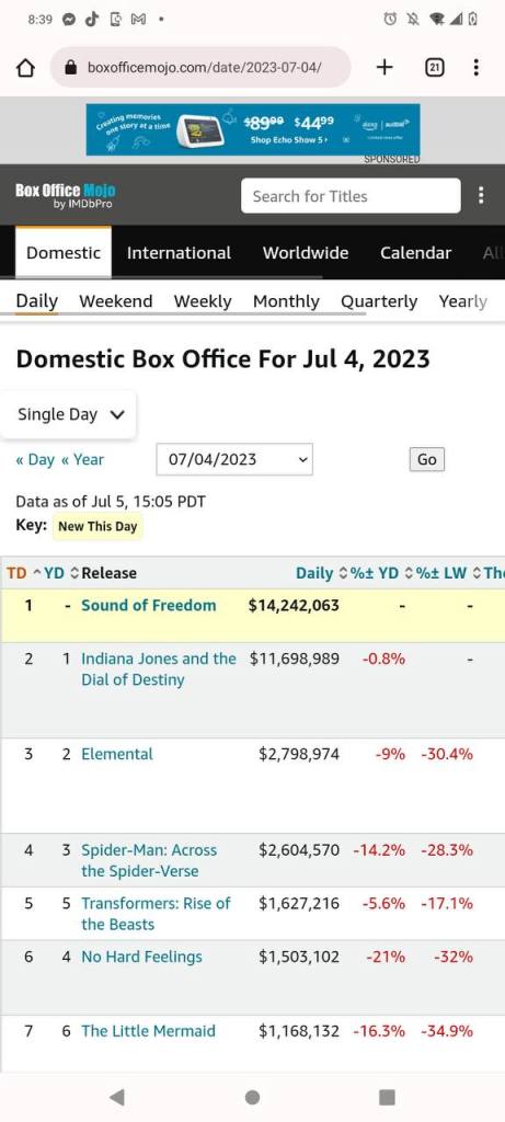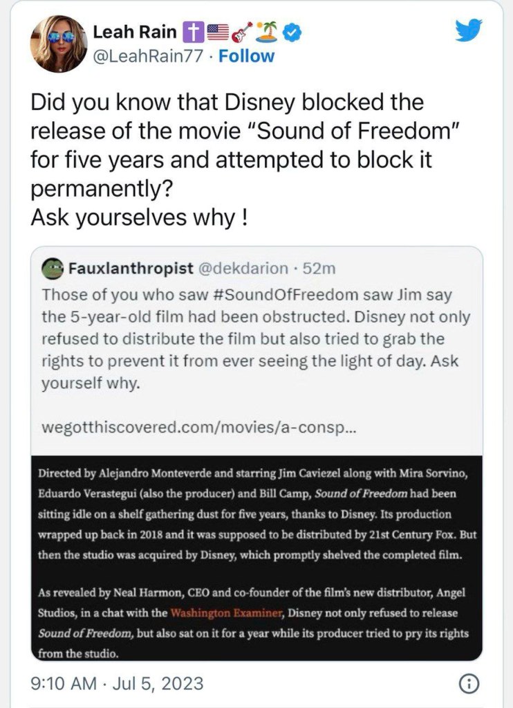 Σε μια ένδειξη μαζικής αντίστασης, η ταινία «Sound of Freedom» των Angel Studios για τη διάσωση παιδιών από διακινητές ανθρώπων πήρε την πρώτη θέση στο box office των ΗΠΑ στις 4 Ιουλίου, όταν η ταινία βγήκε τελικά στους κινηματογράφους σε όλη τη χώρα. Γνωρίζατε ότι η Disney μπλόκαρε την κυκλοφορία αυτής της ταινίας για πέντε χρόνια και προσπάθησε να την εμποδίσει μόνιμα; Αναρωτηθείτε γιατί.