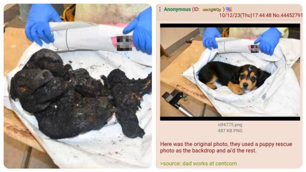Σε ένα άλλο παράδειγμα, μια ψεύτικη φωτογραφία της «φρίκης της Χαμάς» η οποία δημιουργήθηκε από τεχνητή νοημοσύνη, και την οποία μοιράστηκε ο Αμερικανός αρθρογράφος Ben Shapiro και ο ίδιος ο πρωθυπουργός του Ισραήλ, αρχικά αποτύπωνε ένα σκυλί.