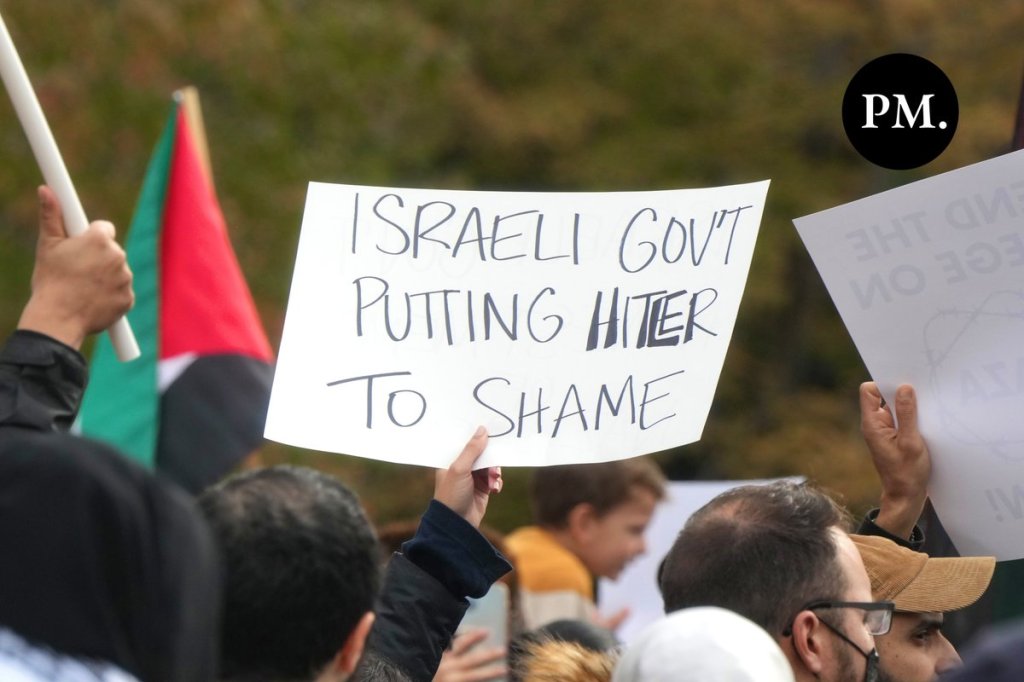 Διόλου περίεργο, λοιπόν, που ένα πανό που εντοπίστηκε μεταξύ των αντι-ισραηλινών διαδηλωτών αναγράφει «Η ισραηλινή κυβέρνηση κάνει τον Χίτλερ να ντρέπεται».