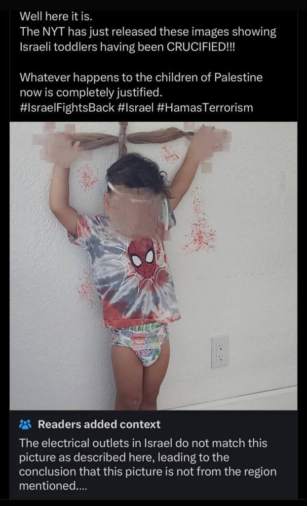 Τα εταιρικά μέσα προπαγάνδας έχουν επίσης χάσει κάθε αυτοσυγκράτηση. Οι New York Times δημοσίευσαν μια φωτογραφία ενός «σταυρωμένου παιδιού» για να δικαιολογήσουν τη δολοφονία των παιδιών της Παλαιστίνης! Αυτό καταρρίφθηκε αμέσως: Κοιτάξτε την αμερικανο/καναδική ηλεκτρική πρίζα στην εικόνα.