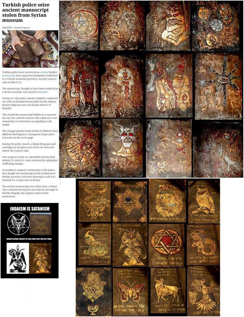 Σαφείς ενδείξεις ότι έχουμε να κάνουμε με μια αρχαία σατανική λατρεία ήρθαν όταν η τουρκική αστυνομία κατάσχεσε τους Πάπυρους της Τορά διακοσμημένους με σατανικούς συμβολισμούς Illuminati που είχαν κλαπεί από τις 2000 ετών Συναγωγές του Σατανά στη Συρία.