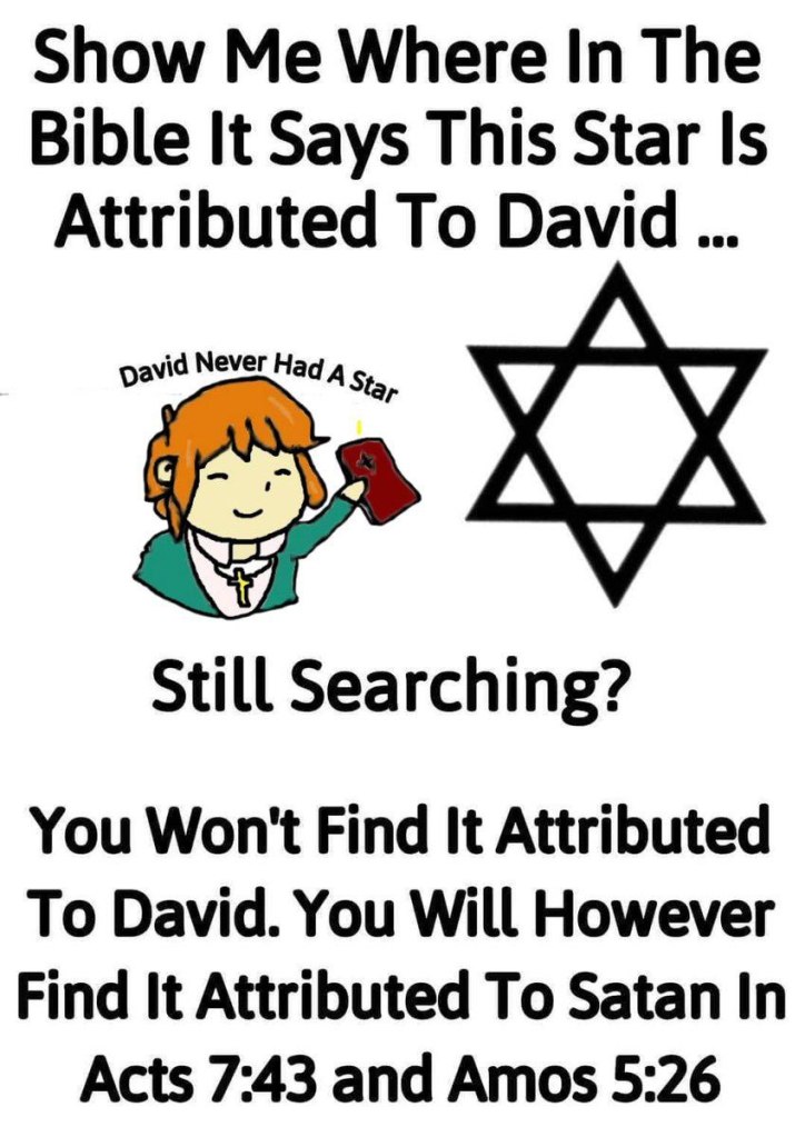 Ας ξεκινήσουμε επισημαίνοντας ότι πουθενά στη Βίβλο δεν αναφέρεται το αστέρι του Δαβίδ. Και μόνο να το αποκαλεί κανείς έτσι αποτελεί προσβολή για τους αληθινούς απογόνους του βασιλιά Δαβίδ. Αυτό συμβαίνει επειδή στις Πράξεις 7:43 και Αμώς 5:26 αναφέρεται ως το αστέρι της θυσιαστικής λατρείας του Μολώχ και του Σατανά, των ορκισμένων εχθρών του βασιλιά Δαβίδ.