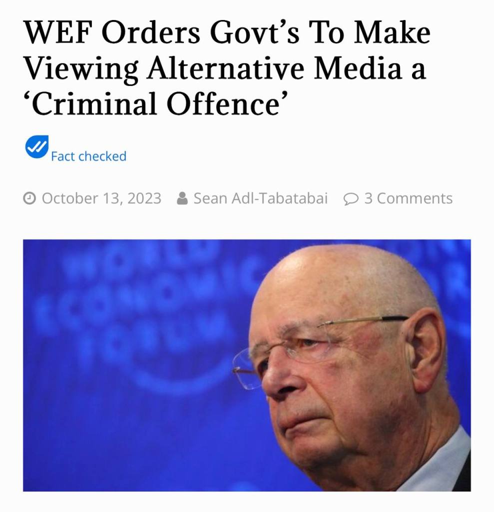Ο Schwab, φυσικά, φρικάρει. Το Παγκόσμιο Οικονομικό Φόρουμ καλεί τις κυβερνήσεις του κόσμου να καταστήσουν «ποινικό αδίκημα» την προβολή ή την κοινή χρήση εναλλακτικών μέσων ενημέρωσης στο διαδίκτυο.