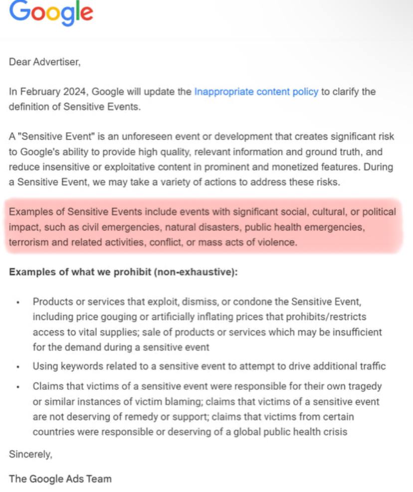 Το προπαγανδιστικό μέσο Google της ΧΜ, από την πλευρά του, προετοιμάζεται για ένα «ευαίσθητο γεγονός». Ένα «ευαίσθητο συμβάν» είναι ένα «απρόβλεπτο συμβάν ή εξέλιξη που δημιουργεί σημαντικό κίνδυνο για την ικανότητα της Google να παρέχει υψηλής ποιότητας σχετικές πληροφορίες και να βασίζεται στην αλήθεια». Με άλλα λόγια, περιμένετε περισσότερη λογοκρισία τύπου Covid 19 από την Google μετά από κάποια νέα μηχανική καταστροφή.