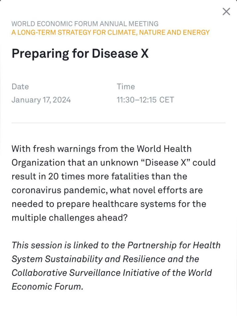 Επίσης, η ΧM στο Νταβός μιλά για «ασθένεια Χ» που θα είχε ως αποτέλεσμα «20 φορές περισσότερους θανάτους από την πανδημία του κοροναϊού». Αυτό ακολουθείται από αναφορές σχετικά με μια νέα εργαστηριακή ασθένεια από την Κίνα (Ασθένεια Χ) η οποία έχει ποσοστό θνησιμότητας 100% σε εξανθρωπισμένα ποντίκια, μολύνοντας το νευρικό σύστημα.
