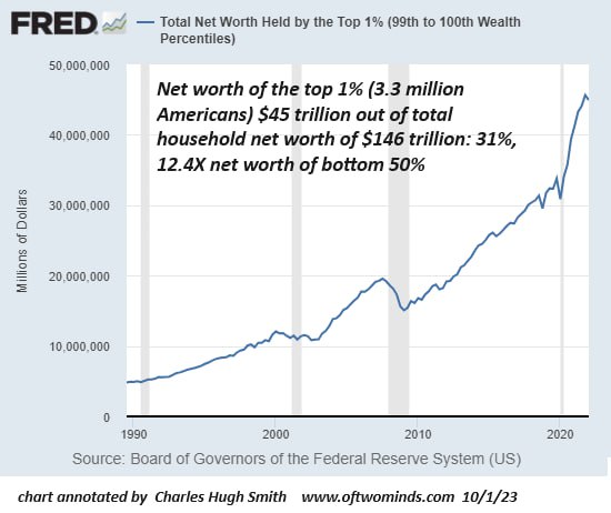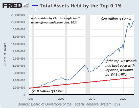 «»Η πίστωση του σχεδόν μηδενικού επιτοκίου διανεμήθηκε ασύμμετρα. Μόνο οι λίγοι πλουσιότεροι είχαν πρόσβαση στην ανοιχτή κάνουλα του «δωρεάν χρήματος»» εξηγεί ο αναλυτής Charles Hugh Smith. Οι υπόλοιποι από εμάς «πληρώναμε πολύ υψηλότερα επιτόκια από ό,τι οι εταιρείες, οι τράπεζες και οι χρηματοδότες», αναφέρει.
