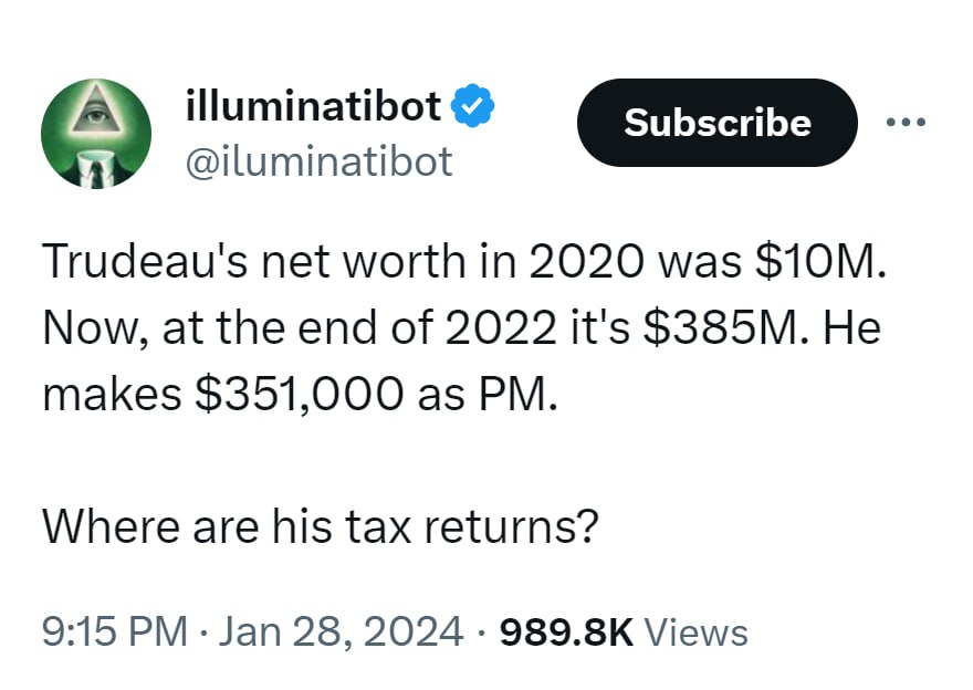 Στον Καναδά, για παράδειγμα, η καθαρή περιουσία του υπουργού εγκλήματος Justin Castrudeau το 2020 ήταν 10 εκατομμύρια δολάρια και στα τέλη του 2022 αυξήθηκε στα 352 εκατομμύρια δολάρια. Κερδίζει μόνο 351,000 $ ετησίως. Έβγαλε χρήματα αναγκάζοντας τους Καναδούς φορολογούμενους να αγοράσουν τοξικά εμβόλια από εταιρείες των οποίων μετοχές κατέχει ο ίδιος. Αυτό το μοτίβο επαναλαμβάνεται σε όλο τον κόσμο.