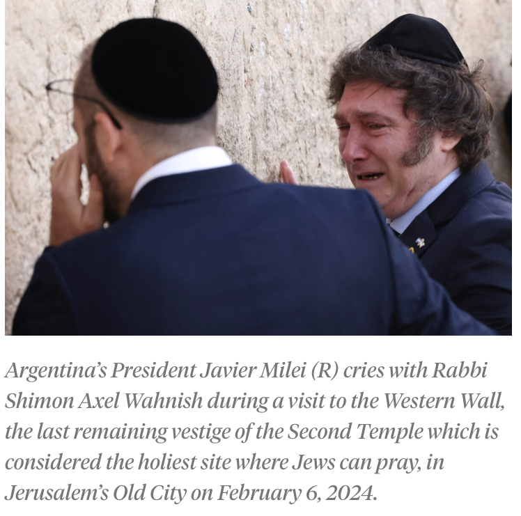 Ο Αργεντινός Πρόεδρος Javier Milei κλαίει μαζί με τον Ραββί Shimon Axel Wahnish τον Φεβρουάριο του 2024κατά την διάρκεια επίσκεψης στο Δυτικό Τείχος, το τελευταίο κατάλοιπο του Δεύτερου Ναού το οποίο θεωρείται ο ιερότερος τόπος στον οποίο μπορούν να προσευχηθούν οι Εβραίοι, στην παλαιά πόλη της Ιερουσαλήμ.