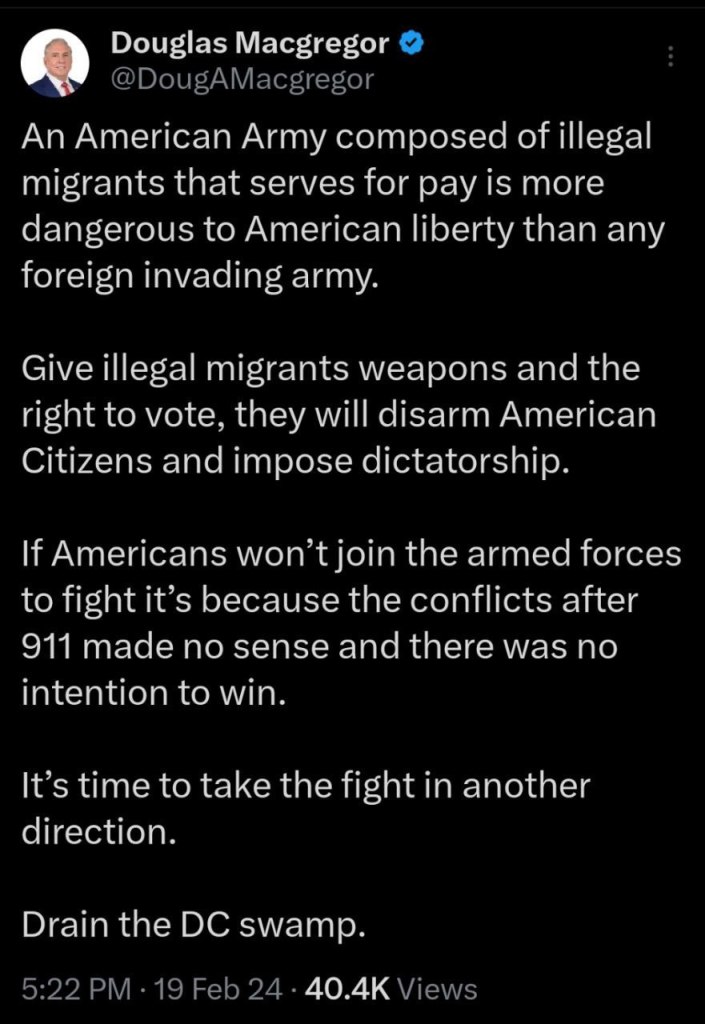 Ο MacGregor προειδοποιεί ότι το Κογκρέσο των ΗΠΑ θέλει να αφήσει τους παράνομους μετανάστες να υπηρετούν στον στρατό των ΗΠΑ. «Όταν οι πιθανοί εχθροί σας διεισδύουν στον δικό σας αμυντικό μηχανισμό, είστε χαμένοι», προειδοποιεί μια πηγή του Πενταγώνου.
