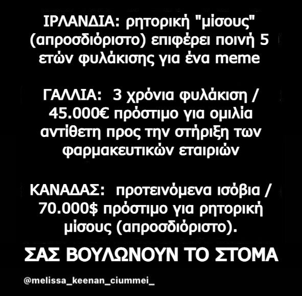 Όταν συνειδητοποίησαν ότι δεν μπορούσαν πλέον να σε ελέγξουν αποκαλώντας σε ρατσιστή/μισαλλόδοξο/ μισογύνη/ ομοφοβικό/ ισλαμοφοβικό, αποφάσισαν να σε απειλήσουν με ισόβια κάθειρξη και πρόστιμο 20 χιλιάδων δολαρίων αν έλεγες άσχημα λόγια γι’ αυτούς στα μέσα κοινωνικής δικτύωσης, με το πρόσχημα της «Προστασίας των Παιδιών».