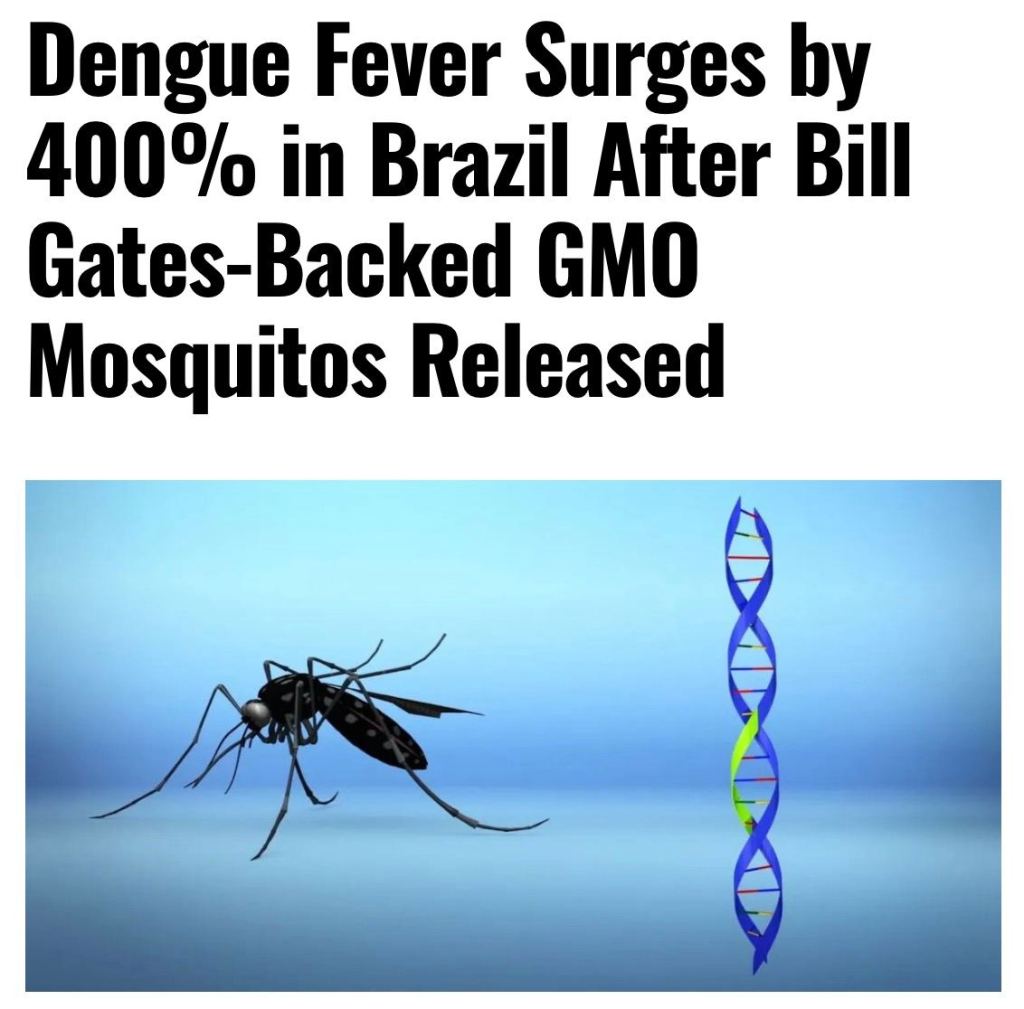 Στο πιο πρόσφατο παράδειγμα, τα κρούσματα δάγκειου πυρετού στη Βραζιλία αυξήθηκαν κατά 400% μετά την απελευθέρωση γενετικά τροποποιημένων κουνουπιών που υποστηρίχθηκαν από τον Bill Gates. Φυσικά, τώρα η κυβέρνηση πρέπει να αγοράσει εκατομμύρια δόσεις εμβολίων (μην πάει ο νους σας στο κακό…)