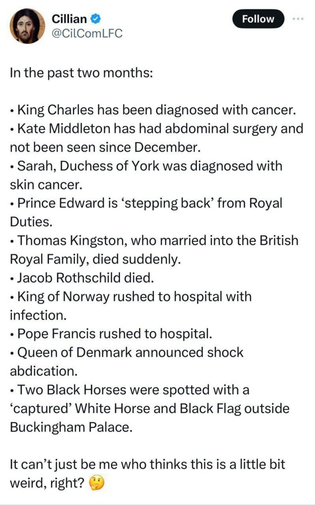«Το έθιμο των βασιλικών ιππέων είναι να μην φέρνουν ποτέ λευκό άλογο χωρίς την παρουσία του βασιλιά και της βασίλισσας. Η παρουσία ενός λευκού αλόγου σημαίνει την παρουσία του βασιλιά. Όταν ο βασιλιάς Κάρολος δεν είναι παρών σε αυτό το ιππικό, σημαίνει ότι είναι νεκρός», λέει μια πηγή της MI6.