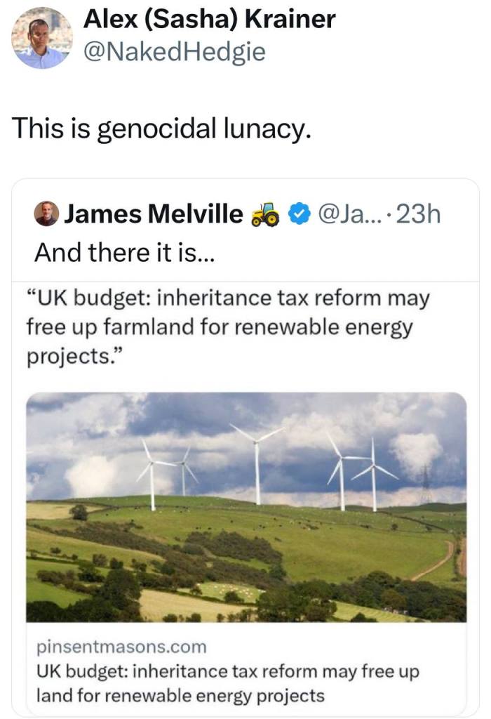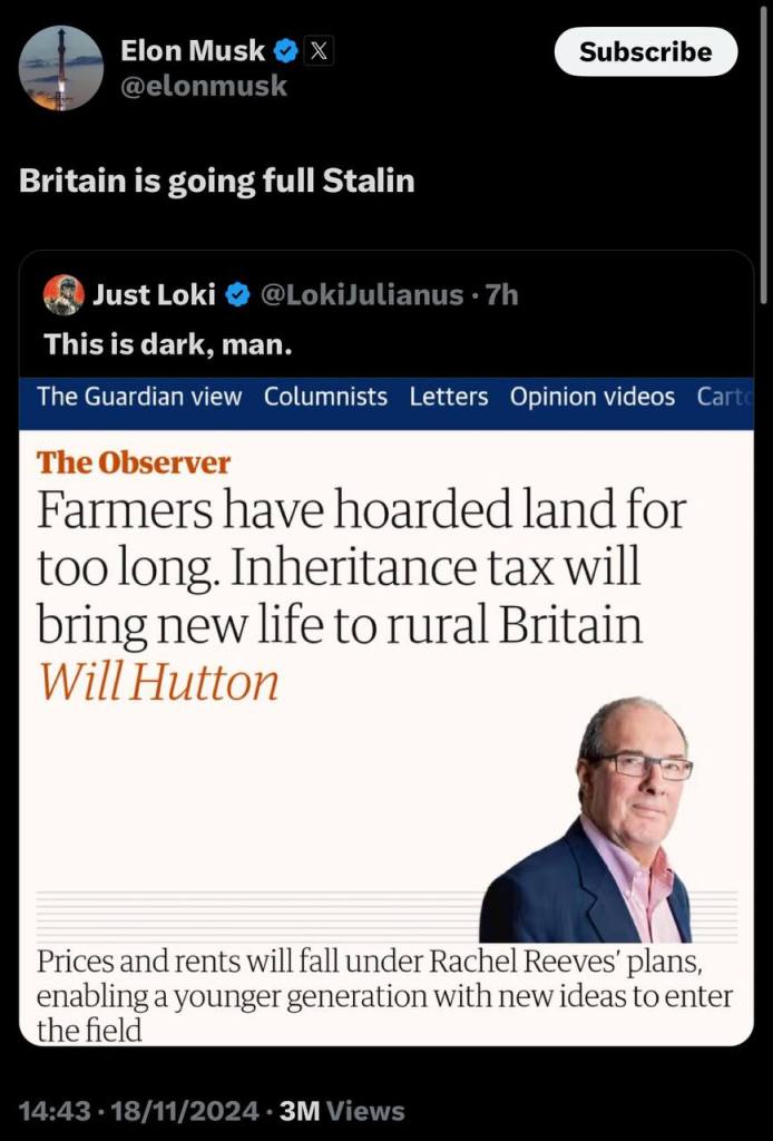 Φυσικά, συμφωνώ με τον Musk σε πολλά πράγματα, ειδικά στο πρόσφατο σχόλιό του ότι ο εκβιαζόμενος παιδεραστής πρωθυπουργός του Ηνωμένου Βασιλείου Keir Starmer «μετατρέπεται ολοταχώς σε Στάλιν» καθώς δείχνει τα διαπιστευτήριά του κατά της ζωής προσπαθώντας να αφήσει τους αγρότες χωρίς δουλειά με τεράστιους φόρους κληρονομιάς.