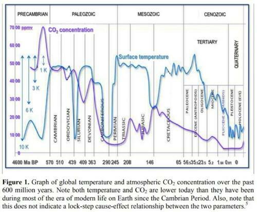 Για να αποδείξουμε ότι αυτοί οι άνθρωποι προσπαθούν ενεργά να καταστρέψουν τη δύναμη της ζωής σε αυτόν τον πλανήτη, ας δούμε κάποια πραγματική επιστήμη. Πρώτα απ ‘όλα, ο άνθρακας δεν προκαλεί υπερθέρμανση του πλανήτη. Όπως δείχνει το παρακάτω διάγραμμα, τα υψηλά επίπεδα άνθρακα έχουν συσχετιστεί με χαμηλές θερμοκρασίες στην πλανητική ιστορία μας.
