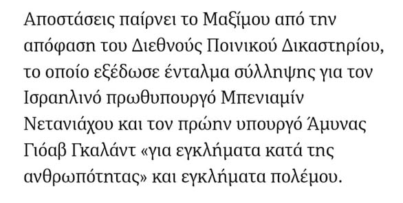 Ο υπόλοιπος κόσμος αναλαμβάνει ήδη δράση. Το Διεθνές Ποινικό Δικαστήριο (ΔΠΔ) εξέδωσε στις 21 Νοεμβρίου εντάλματα σύλληψης για τον ισραηλινό πρωθυπουργό Μπέντζαμιν Νετανιάχου και τον πρώην υπουργό Άμυνας Γιοάβ Γκάλαντ για φερόμενα «εγκλήματα κατά της ανθρωπότητας και εγκλήματα πολέμου», συμπεριλαμβανομένης της λιμοκτονίας ως μεθόδου πολέμου, σκόπιμης κατεύθυνσης επιθέσεων εναντίον αμάχων, καθώς και «δολοφονίας, δίωξης και άλλων απάνθρωπων πράξεων».