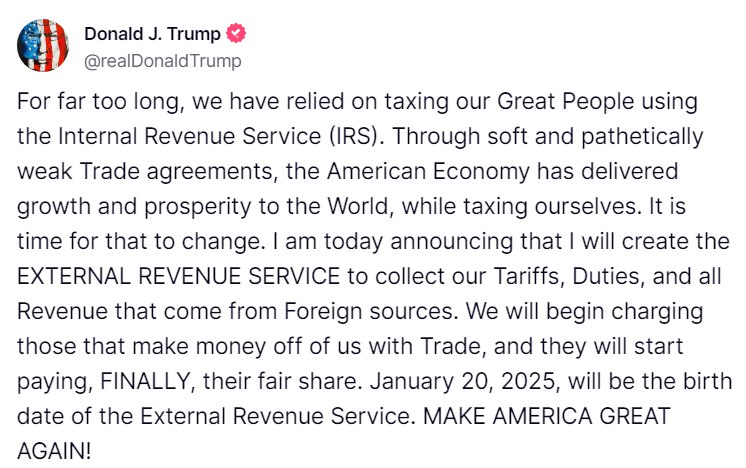 Ανακοινώνω σήμερα ότι θα δημιουργήσω την ΥΠΗΡΕΣΙΑ ΕΞΩΤΕΡΙΚΩΝ ΕΣΟΔΩΝ για να εισπράττω τα τιμολόγια, τους δασμούς και όλα τα έσοδα που προέρχονται από ξένες πηγές. Θα αρχίσουμε να χρεώνουμε εκείνους που κερδίζουν χρήματα από εμάς μέσω του εμπορίου και θα αρχίσουν να πληρώνουν, ΕΠΙΤΕΛΟΥΣ, το δίκαιο μερίδιό τους. Η 20η Ιανουαρίου 2025 θα είναι η ημερομηνία γέννησης της Υπηρεσίας Εξωτερικών Εσόδων. ΑΣ ΚΑΝΟΥΜΕ ΤΗΝ ΑΜΕΡΙΚΗ ΣΠΟΥΔΑΙΑ ΞΑΝΑ!