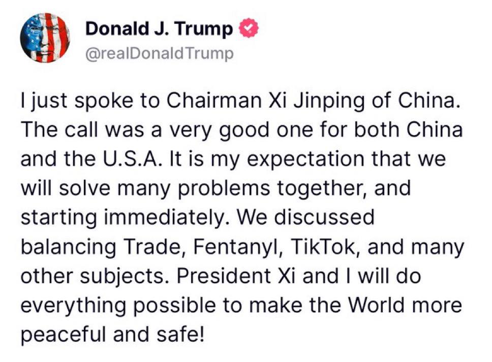 Ο Τραμπ έγραψε: «Το τηλεφώνημα ήταν πολύ καλό τόσο για την Κίνα όσο και για τις ΗΠΑ… Προσδοκία μου είναι ότι θα λύσουμε πολλά προβλήματα μαζί και θα ξεκινήσουμε αμέσως. Συζητήσαμε την εξισορρόπηση του εμπορίου, της φαιντανύλης, του TikTok και πολλών άλλων θεμάτων. Ο πρόεδρος Σι και εγώ θα κάνουμε ό,τι είναι δυνατόν για να κάνουμε τον κόσμο πιο ειρηνικό και ασφαλή.