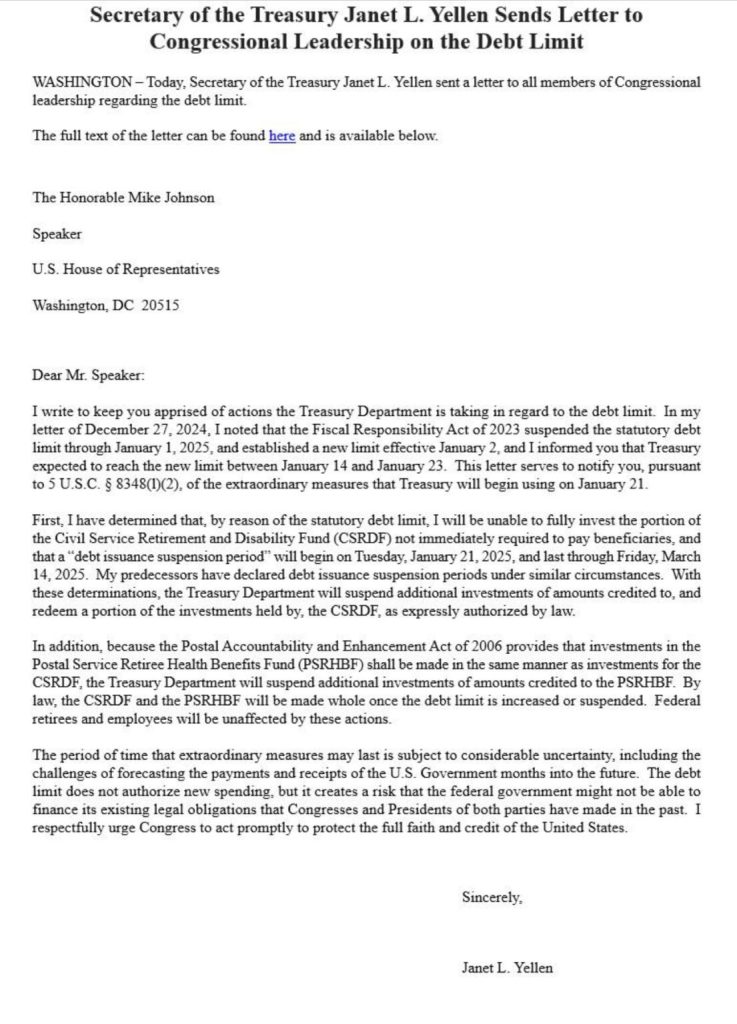 Κάτι τέτοιο είναι απαραίτητο, επειδή, στην τελευταία επίσημη πράξη της, η υπουργός Οικονομικών Janet Yellen προειδοποίησε ότι οι ΗΠΑ θα χτυπήσουν το ανώτατο όριο του χρέους τους μία ημέρα μετά την ορκωμοσία του Τραμπ.