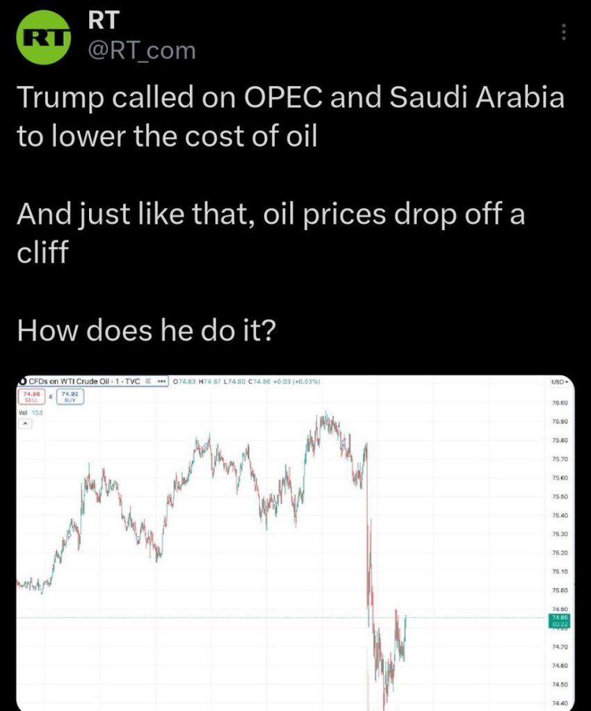 Αυτό το σχόλιο ήρθε αφού ο Τραμπ, μετά από μια εισαγωγή από τον ήδη νεκρό Δρ Evil (Klaus Schwab Rothschild), χαστούκισε ολόκληρη τη διεθνή κλίκα των παγκοσμιοποιημένων σατανικών παιδεραστών ακριβώς στο πρόσωπο. Τους είπε ότι θα μειώσει τις τιμές του πετρελαίου και θα αυξήσει την παραγωγή πετρελαίου, σε μια κίνηση που θα τερματίσει εντελώς τα σχέδιά τους κατά της «απανθρακοποίησης» της ζωής. Μετά από αυτό, ο Τραμπ κάλεσε τον ΟΠΕΚ και τη Σαουδική Αραβία να μειώσουν το κόστος του πετρελαίου και έτσι απλά, οι τιμές του πετρελαίου κατακρημνίστηκαν.
