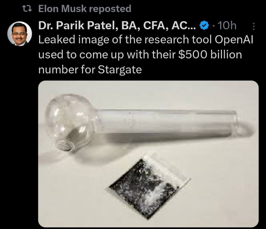 Το ενδιαφέρον είναι η αντίδραση του Μασκ. Είπε: «Στην πραγματικότητα δεν έχουν τα χρήματα… Η SoftBank έχει εξασφαλίσει πολύ κάτω από 10 δισεκατομμύρια δολάρια. Η πληροφορία είναι εγγυημένη.» Στη συνέχεια δημοσίευσε μια εικόνα μιας πίπας κρακ για να δείξει με ποιον τρόπο το OpenAl κατέληξε στον αριθμό των 500 δισεκατομμυρίων δολαρίων για το Stargate.