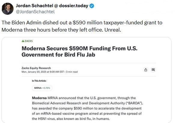 Σε κάτι που ίσως είναι χρηματοδότηση βιολογικού πολέμου της τελευταίας στιγμής, η κυβέρνηση Μπάιντεν μοίρασε μια χρηματοδοτούμενη από τους φορολογούμενους επιχορήγηση 590 εκατομμυρίων δολαρίων στη Moderna τρεις ώρες πριν αποχωρήσει από την εξουσία.