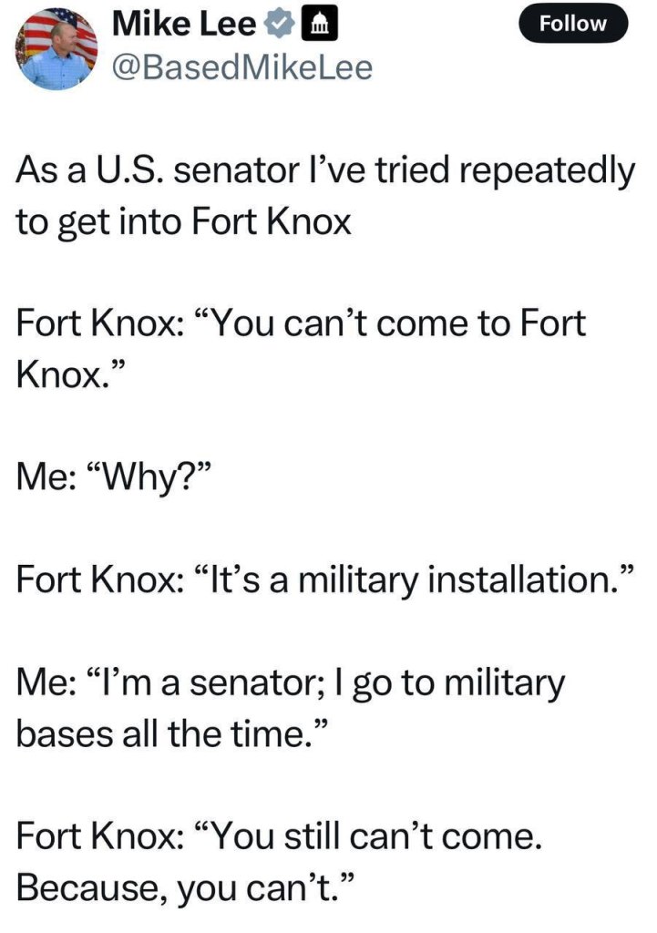 Αυτός είναι επίσης ο λόγος για τον οποίο δεν αφήνουν γερουσιαστές όπως ο Mike Lee να επισκεφθούν το Fort Knox.