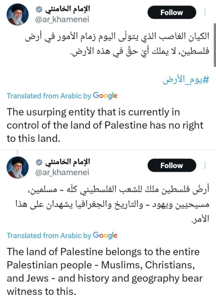 Ο Χαμενεΐ, Ανώτατος Ηγέτης του Ιράν, λέει «Η γη της Παλαιστίνης ανήκει σε ολόκληρο τον παλαιστινιακό λαό – μουσουλμάνους, χριστιανούς και εβραίους – και η ιστορία και η γεωγραφία το μαρτυρούν αυτό».