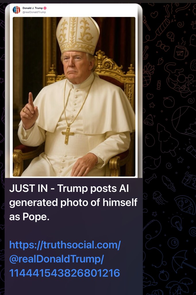 Δημοσιεύοντας μια φωτογραφία του ως Πάπας, ο Ντόναλντ Τραμπ προσπαθεί να τοποθετηθεί ως αδιαμφισβήτητος ηγέτης της Δύσης. Έχει φορέσει την παπική τιάρα επειδή έχει ξεκινήσει αναμέτρηση για το ποιος κυβερνά τη Δύση.