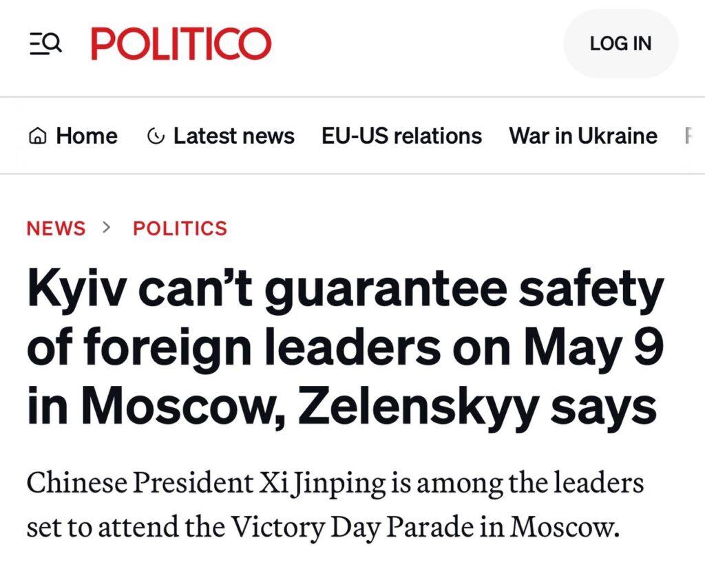 Η ΧΜ τώρα εντείνει τις προκλήσεις της στην Ουκρανία. Ο Ουκρανός δικτάτορας Βλαντιμίρ Ζελένσκι απειλεί τους ηγέτες –συμπεριλαμβανομένου του Κινέζου προέδρου Σι Τζινπίνγκ– που συγκεντρώνονται στη Μόσχα στις 9 Μαΐου για την παρέλαση νίκης του Β’ Παγκοσμίου Πολέμου. Λέει: «Δεν έχουμε και δεν μπορούμε να έχουμε περιορισμούς. Θα αντιληφθούμε τη στρατιωτική παρέλαση του εχθρού ως νόμιμο στόχο. Θα είσαι εκεί, πράγμα που σημαίνει ότι μπορεί να πεθάνεις».