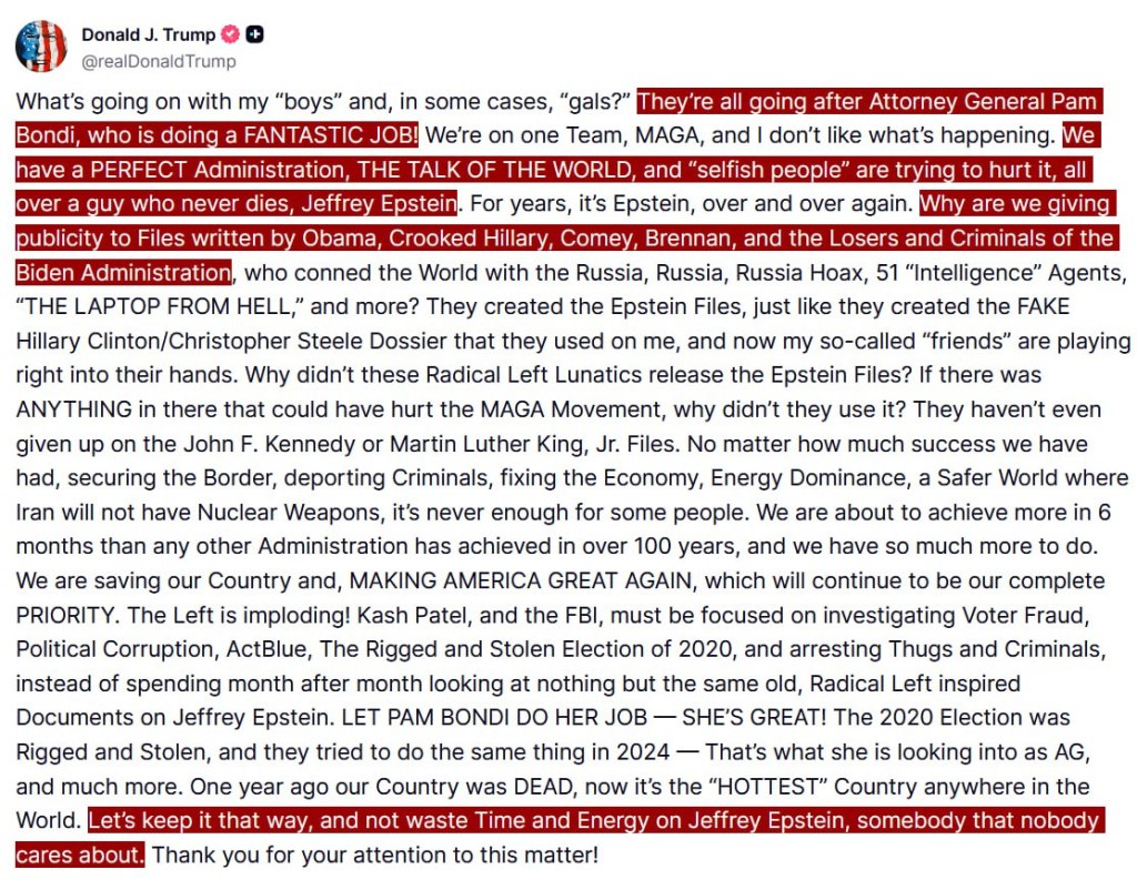 «Όλοι κυνηγούν την Γενική Εισαγγελέα Παμ Μπόντι, η οποία κάνει ΦΑΝΤΑΣΤΙΚΗ ΔΟΥΛΕΙΑ… Γιατί δίνουμε δημοσιότητα σε αρχεία που έχουν γραφτεί από τον Ομπάμα, την απατεώνα Χίλαρι, τον Κόμεϊ, τον Μπρέναν και τους Ηττημένους και Εγκληματίες της κυβέρνησης Μπάιντεν;»