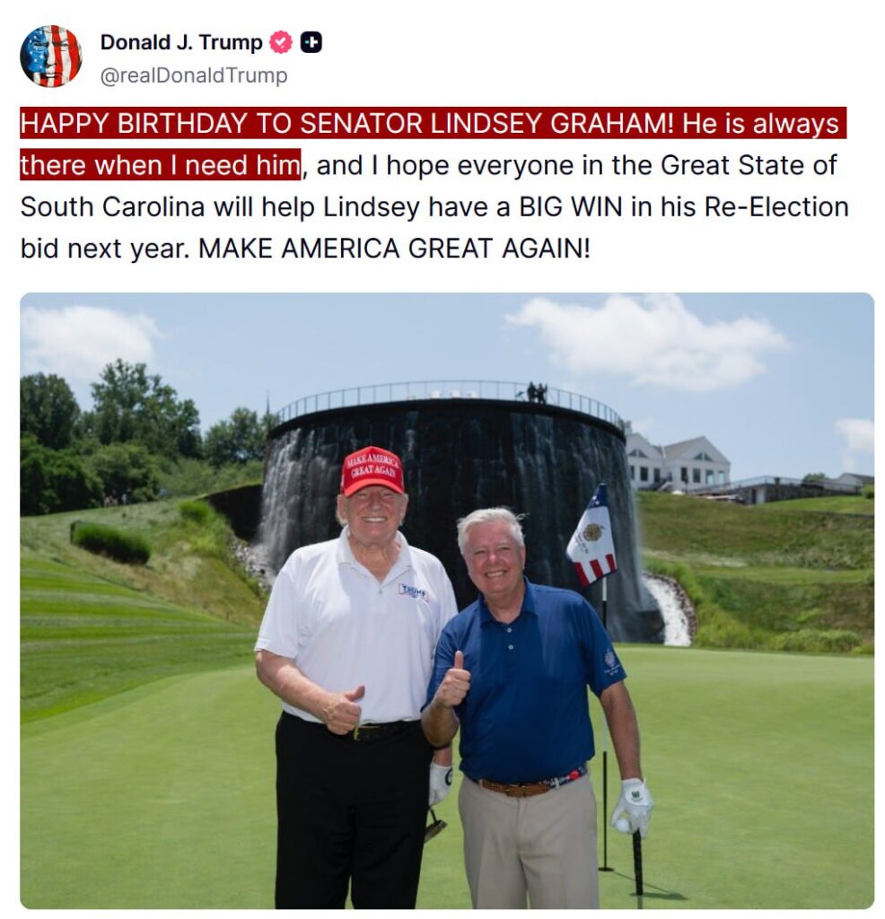 Τώρα ο «Τραμπ» δημοσιεύει: «ΧΡΟΝΙΑ ΠΟΛΛΑ ΣΤΟΝ ΓΕΡΟΥΣΙΑΣΤΗ ΛΙΝΤΣΕΪ ΓΚΡΑΧΑΜ! Είναι πάντα εκεί όταν τον χρειάζομαι».