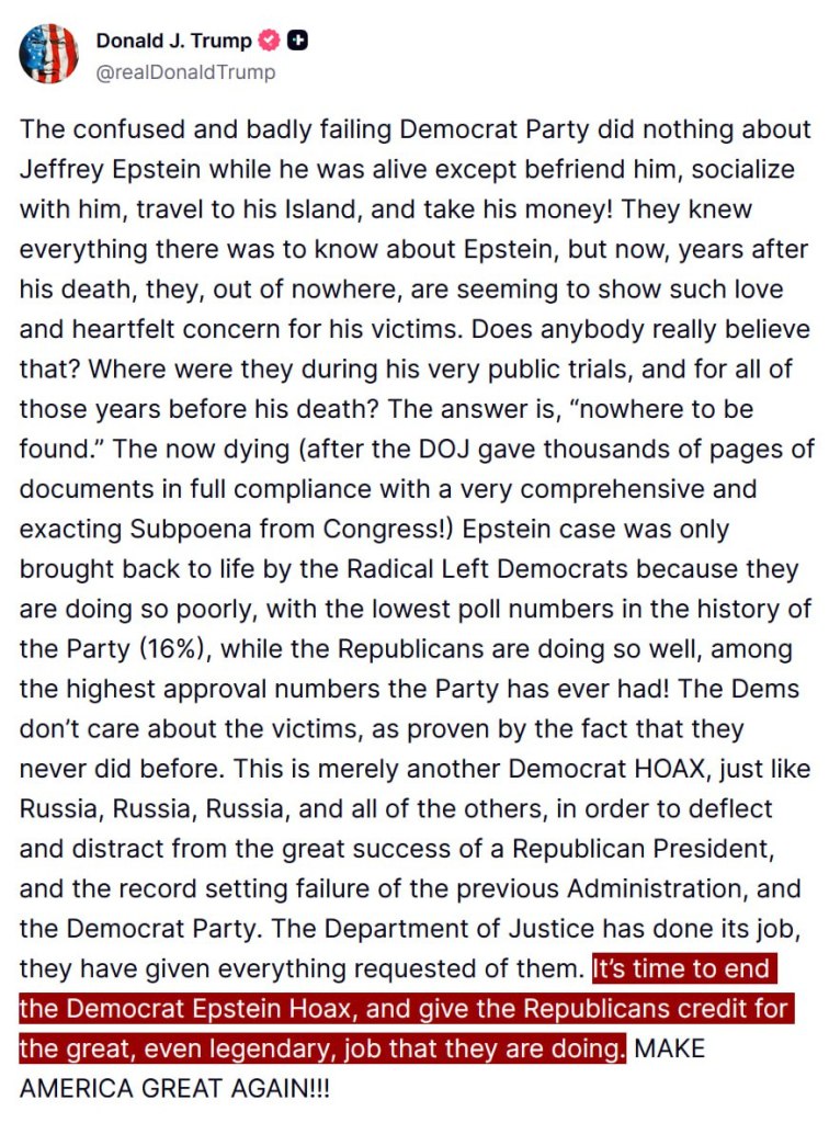 Το κλειδί θα είναι η υπόθεση Έπσταϊν. Εδώ, είναι προφανές ότι ο ψεύτικος Τραμπ χάνει την πλεκτάνη σε μεγάλο βαθμό. Την περασμένη εβδομάδα ο «Τραμπ» έγραψε: «Ήρθε η ώρα να τερματίσουμε την απάτη των Δημοκρατικών για τον Έπσταϊν και να δώσουμε στους Ρεπουμπλικάνους τα εύσημα για τη σπουδαία, ακόμη και θρυλική, δουλειά που κάνουν».