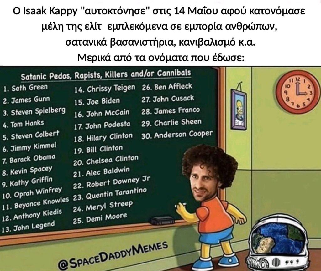 Για όσους δεν θέλουν να διαβάσουν ολόκληρη τη λίστα, ο Ισαάκ Κάπι «αυτοκτόνησε» στις 14 Μαΐου, αφού κατονόμασε μέλη της ελίτ που εμπλέκονται σε εμπορία ανθρώπων, σατανικά βασανιστήρια, κανιβαλισμό και άλλα…