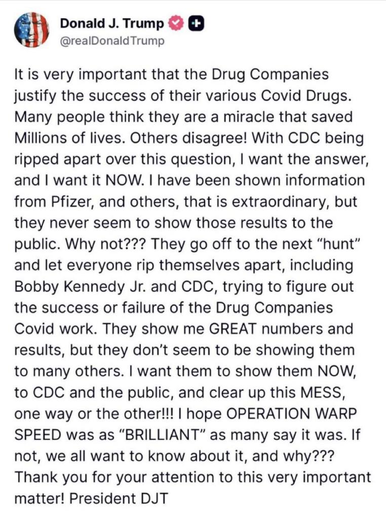 Σαφώς, ο ψεύτικος Τραμπ αναζητά μια διέξοδο σε αυτό το ζήτημα. Δημοσίευσε: «Ελπίζω η ΕΠΙΧΕΙΡΗΣΗ WARP SPEED να ήταν τόσο «Εξαιρετική» όσο λένε πολλοί. Αν όχι, όλοι θέλουμε να μάθουμε γι’ αυτήν, και γιατί».