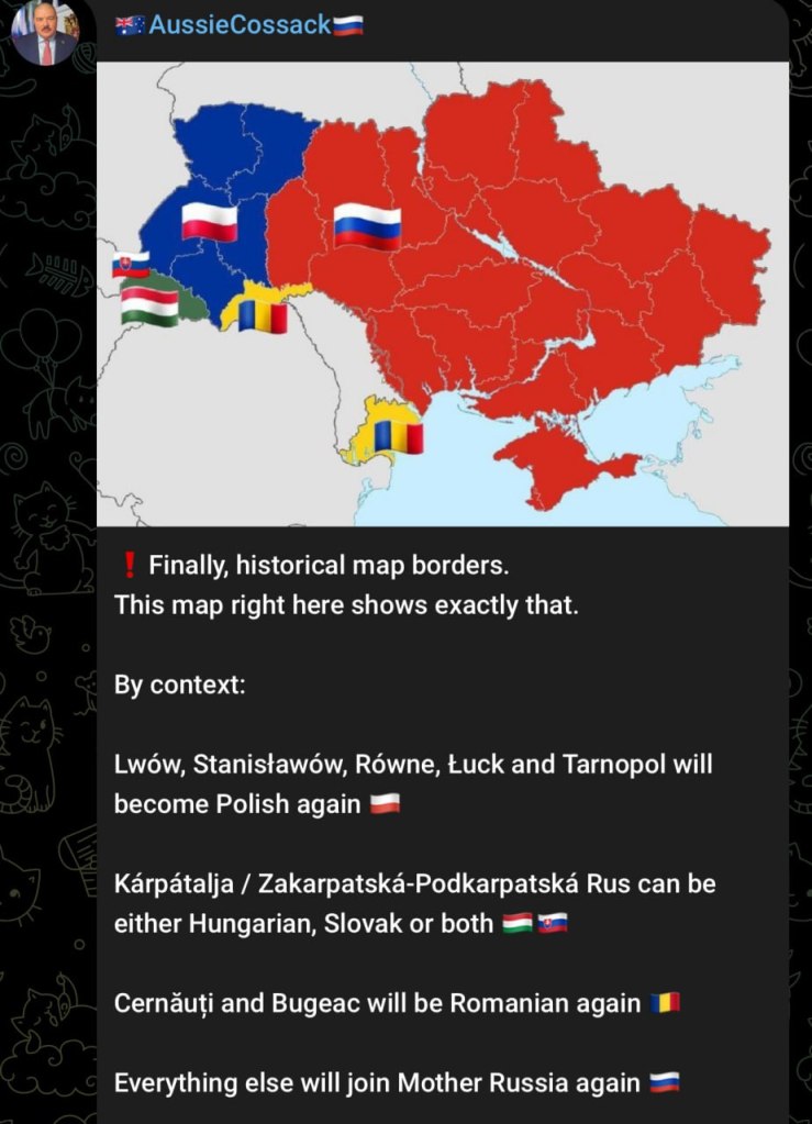 Παρακάτω μπορείτε να δείτε έναν χάρτη που μας έστειλαν οι αυστραλιανές μυστικές υπηρεσίες, ο οποίος δείχνει ακριβώς πώς θα διαιρεθεί η Ουκρανία μεταξύ Πολωνίας, Ρουμανίας, Ουγγαρίας και Ρωσίας στο πλαίσιο αυτής της συμφωνίας.