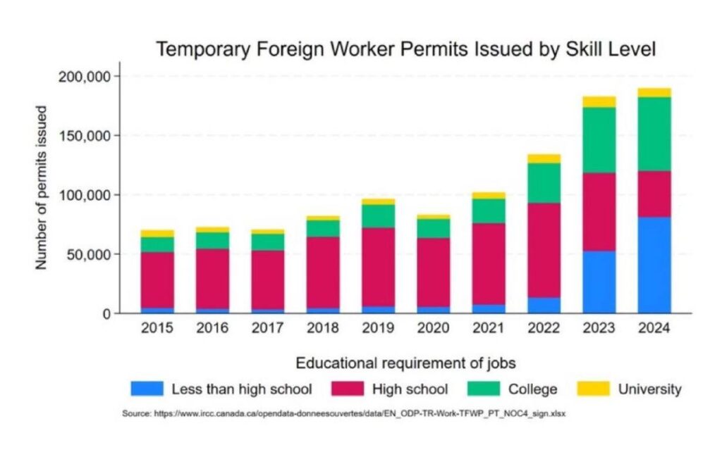 Δεν πρόκειται για την εισαγωγή εξειδικευμένων εργαζομένων που συνεισφέρουν στην κοινωνία, όπως συνέβαινε στο παρελθόν. Το πρόγραμμα προσωρινών αλλοδαπών εργαζομένων του Καναδά εισάγει μαζικά μερικούς από τους λιγότερο μορφωμένους μετανάστες στον κόσμο. Όχι μόνο οι περισσότερες από τις θέσεις εργασίας για τις οποίες έρχονται εδώ δεν απαιτούν εκπαίδευση ή δεξιότητες, αλλά η ταχύτερα αναπτυσσόμενη βάση μεταναστών είναι αυτή που δεν έχει καν αποφοιτήσει από το λύκειο.