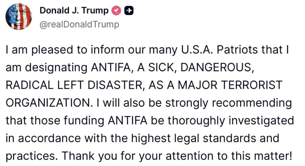 «Με χαρά ενημερώνω τους πολλούς Αμερικανούς Πατριώτες μας ότι χαρακτηρίζω την ANTIFA, ΜΙΑ ΑΡΡΩΣΤΗ, ΕΠΙΚΙΝΔΥΝΗ, ΡΙΖΟΣΠΑΔΙΚΗ ΑΡΙΣΤΕΡΗ ΚΑΤΑΣΤΡΟΦΗ, ΩΣ ΜΕΓΑΛΗ ΤΡΟΜΟΚΡΑΤΙΚΗ ΟΡΓΑΝΩΣΗ…»